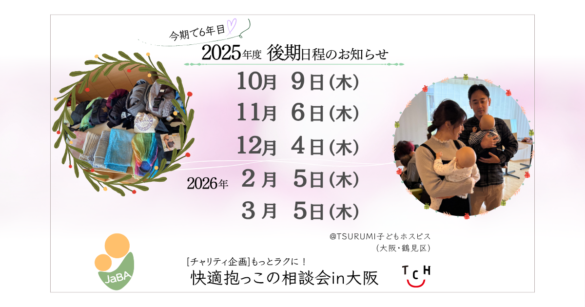 大阪のTSURUMIこどもホスピス様(TCH)で開催している《チャリティ企画 もっとラクに!快適 抱っこの相談会in大阪》。当相談会は参加費の50%をTSURUMIこどもホスピス様へ寄付するチャリティイベントです。2023年度は、32組、72名のご家族がご参加下さり、22,500円を寄付させていただきました。ご参加ありがとうございました!